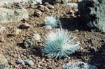The silversword plant, called ahinahina or "gray-gray" by the Hawaiians is a member of the sunflower family. It grows for 5 to 20 years. This spectacular plant with its many dagger-like silvery leaves develops a cluster of 100 to 500 yellow and reddish-purple flower heads. It blooms once in its life and dies after blooming. It probably descended from ancestors whose seeds was carried by air currents across the Pacific from the Americas. |